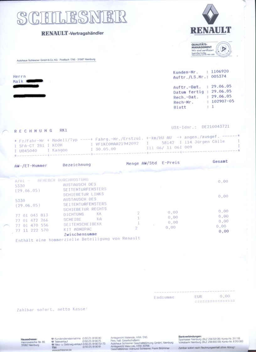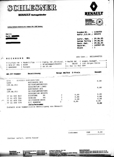 | aktuell | 17:03, 30. Sep. 2009 | 816 × 1.122 (96 KB) | Maik63de (Diskussion | Beiträge) | Null Euro Rechnung Kostenübernahme durch Renault bei Rost an den hinteren Fensterrahmen an den Schiebetüren Quelle: Maik Neumann | |